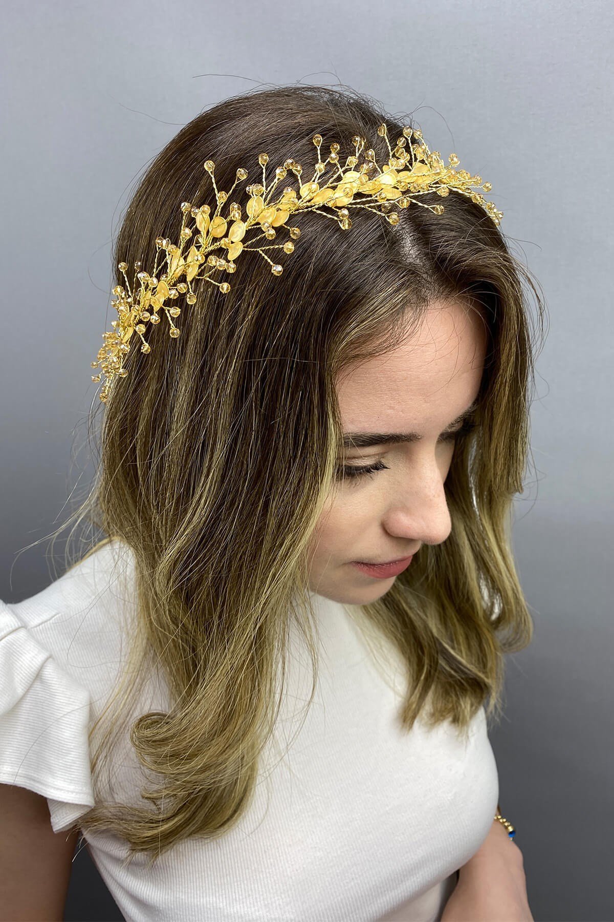 Altın Sarısı Mineli Bahar Dalı Saç Aksesuarı Gelinlerin Kınalarda Bindalı ve Kına Kıyafetlerinin Üzerine Aksesuar Olarak En Çok Tercih Ettigi Kullanılan El İşçiliği İle Yapılan Kına Tacı Modeli. Göz Alıcı ve Zarif Bir Aksesuar İsteyen Gelinlerin Tercihi Olabilecek Saç Akseauarı Gelin Kına Tacı.