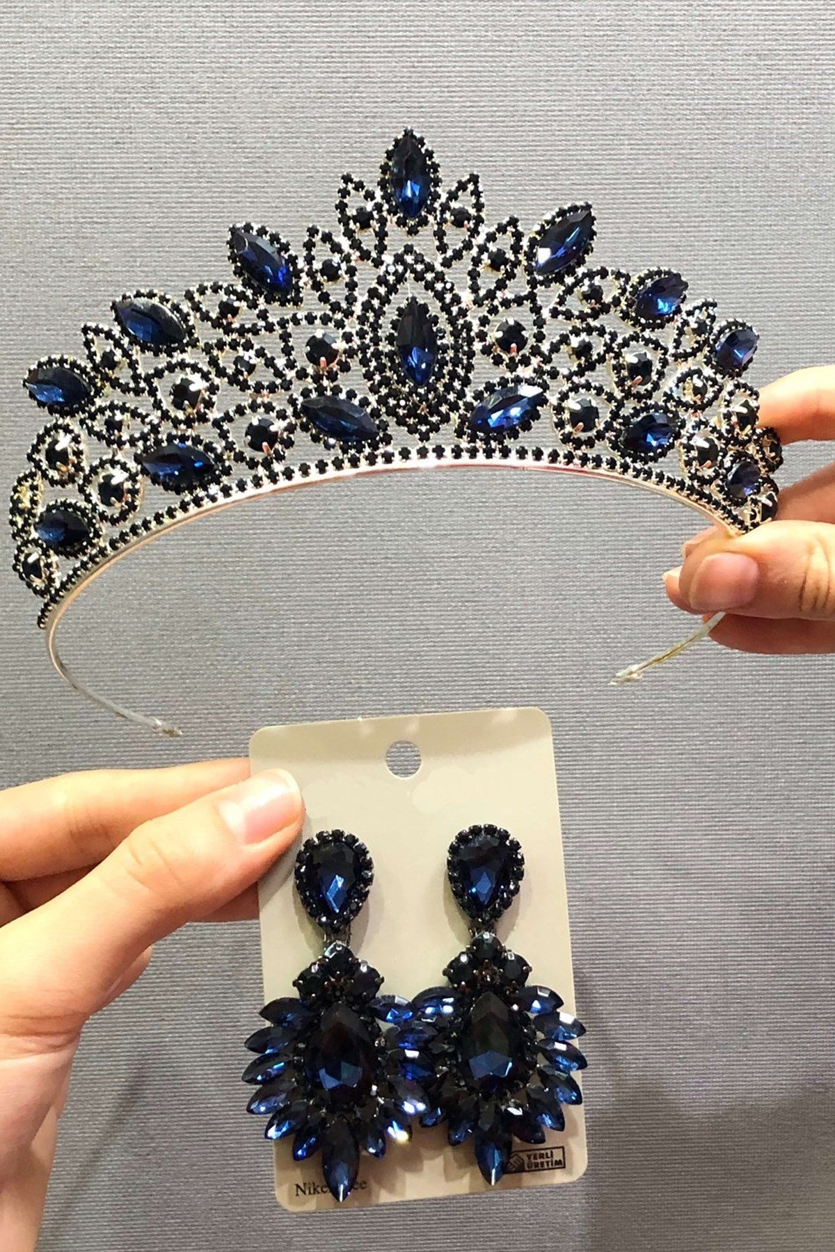 Lacivert Renk Gelin Kına Tacı ve Küpe Takım (TAC-167)