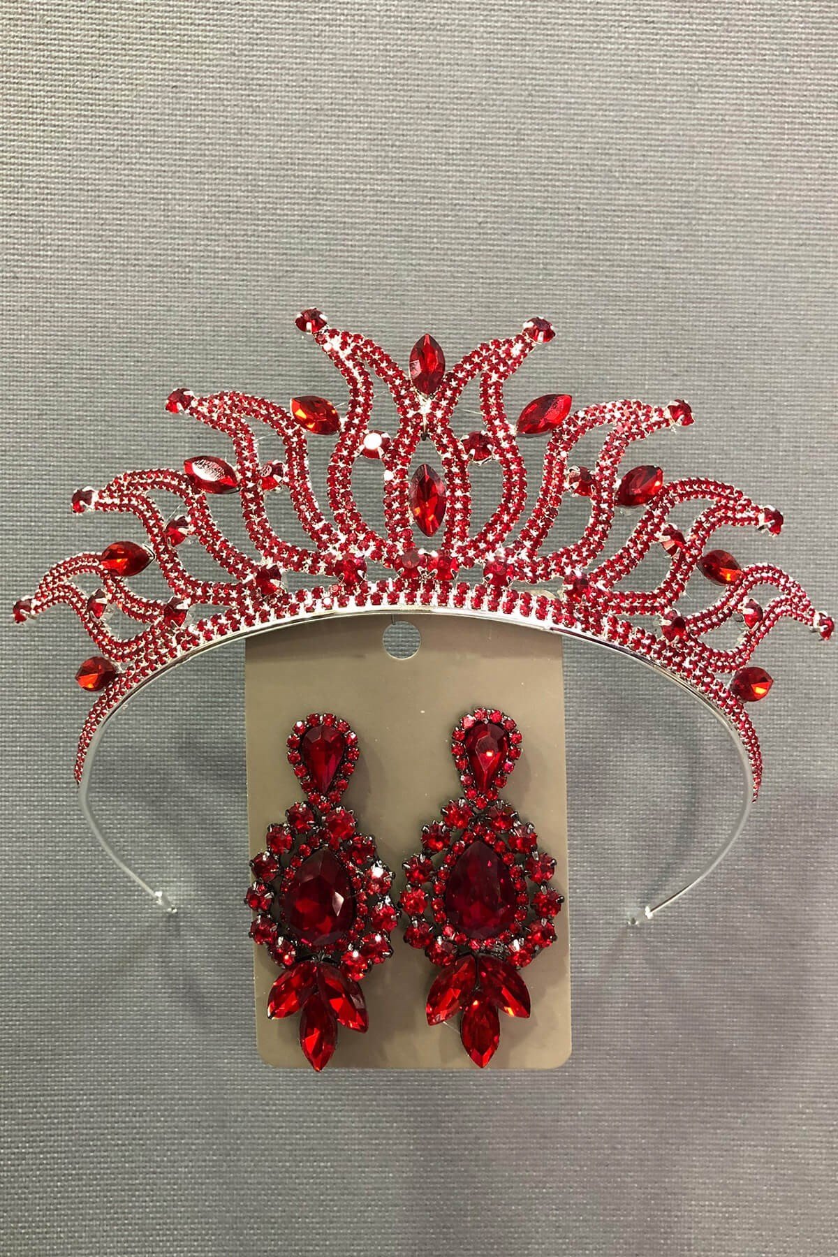 Yakut Rengi Kristal Cam Taşlı Gümüş Rengi Kına Tacı ve Küpe Takımı (TAC-231)
